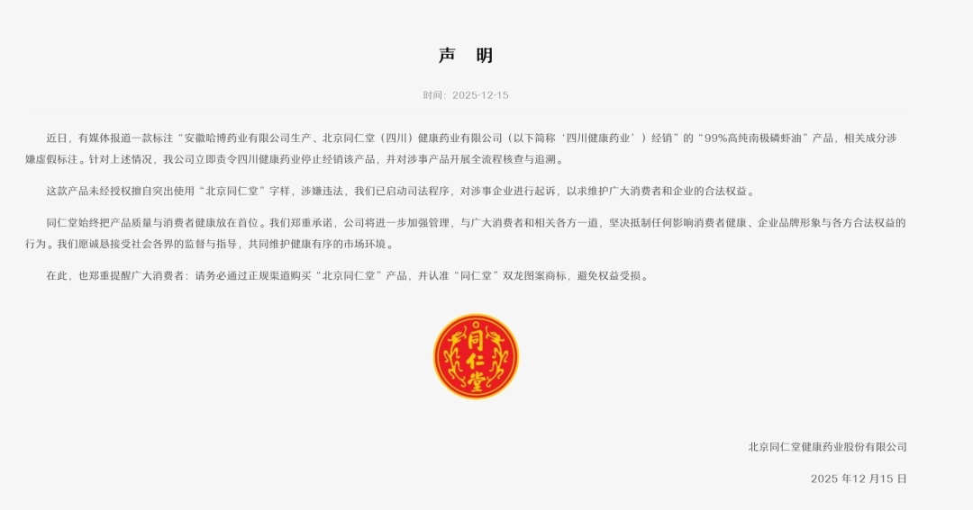 12月15日,北京同仁堂健康药业股份有限公司就此事发布声明。同仁堂健康称,公司立即责令四川健康药业停止经销该产品,并对涉事产品开展全流程核查与追溯。